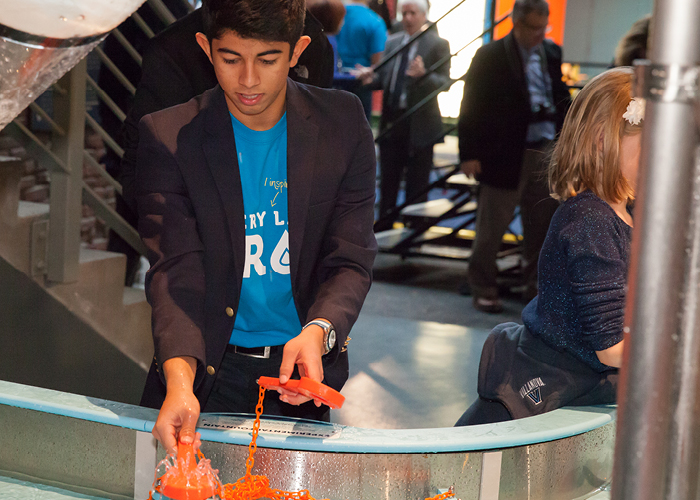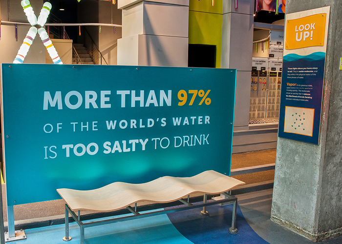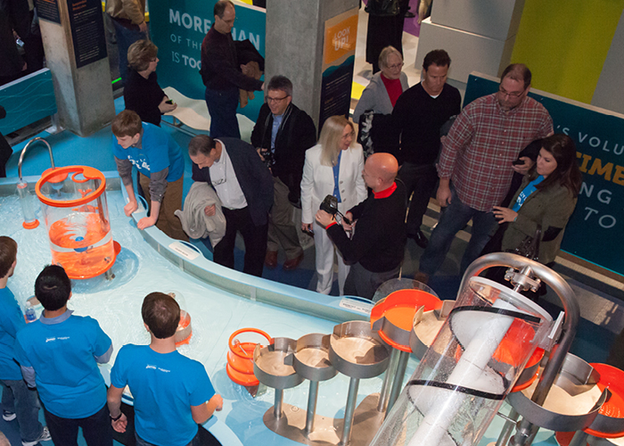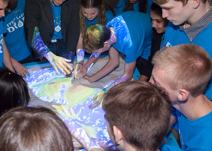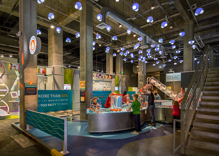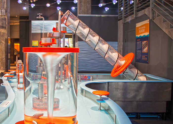 Splash and learn at two activity-packed Water Tables, or make water move uphill with an Archimedes Screw. Look up! The lights have a story to tell. They’re Suspended Water Molecules, and they reflect the physical states of the three phases of water. Ice, liquid or vapor — water is a beautiful, captivating wonder. Investigate the Phases of Water through three interactive touchscreens. In Tapped Out, learn more about how we use water and why we should conserve it. At Cleaning Our Water, pump water, press levers and turn basins at the interactive water treatment wall. Step on the Projected River to make waves and chase fish. In Exploring an Aquifer, go deep in the earth where groundwater is found. Sculpt your own landscape on the Interactive Sand Table, make it rain and watch water flow through valleys.